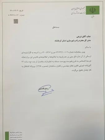 متن نامه وزیر راه خطاب به شریفی مدیرکل راه و شهرسازی استان کرمانشاه به شرح زیر است؛